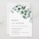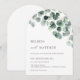 This elegant minimalist contemporary arched wedding invitation features watercolor painted eucalyptus leaves and gold foliage on a white background.