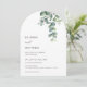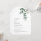 This elegant minimalist contemporary arched wedding invitation features watercolor painted eucalyptus leaves on a white background.