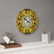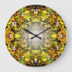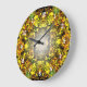 Yellow and orange autumn leaves form a geometric pattern. Blue clock numerals make it easy to tell the time.