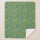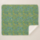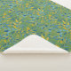 Beautiful pattern features branches of leaves in blues and golds on green background, complimenting a variety of home decor themes from mid-century to modern.