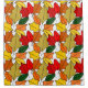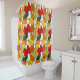 This shower curtain has a design of leaves repeating to make a pile of leaves in shades of yellow, red, orange, and green.