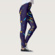 Leggings feature a dark purple background with vibrant geometric patterns in yellow, orange, and blue. Paired with black-and-white sneakers. Modern and dynamic.