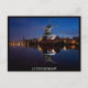 Postcard of the windmill 'Salamander' with reflection in the water of the Vliet river with lights on at the beginning of the night in the city of Leidschendam in the Netherlands with a black edge and in a black the box the white text 'Leidschendam'.