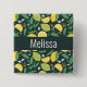 Button with a cute pattern featuring yellow lemons and green lime fruit with stalks of leaves set on a dark green background.