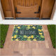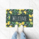 Welcome doormat with a cute pattern featuring yellow lemons and green lime fruit with stalks of leaves set on a dark green background.