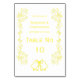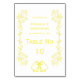 Yellow wedding table number bells design. You can customise this lemon coloured wedding table number with your own wedding details. Should you require any help with customising then contact us through the link on this page. Bells scrollwork design personalised yellow coloured wedding table number