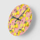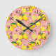 Lemon Blossom Pink Clock. This clock features a cheerful pattern of lemons, white blossoms, and green leaves set against a soft pink background—bringing the vibe of pink lemonade to any room!