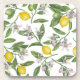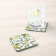Lemon branches with blossoms and fruit on white coaster