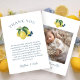 This Lemon Baby Shower thank you card features a design of lemons and a blue butterfly with your photo on the back. Simply personalise the script for your needs with this elegant design. Sweet design detail on the back where you can add a handwritten note or leave blank.