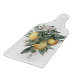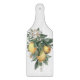 This lovely lemon fruit cutting board measures 4.75" x 12.75" and is made of hand-pressed tempered glass. Available in five different sizes, it's 100% food safe with non-skid rubber feet.