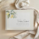 This modern elegant mediterranean design features beautiful watercolor lemons and olives on a butter yellow background.
