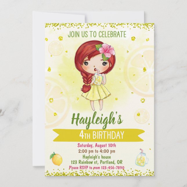 Cute invitation for your little sweetie's birthday party featuring yellow lemons, lemonade and redhead girl with ginger hair.