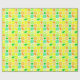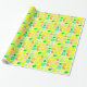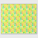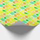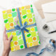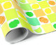 Wrapping paper with a colourful citrus fruit pattern of lemons, limes, oranges and citrus slices on squares of white, orange, teal and yellow.
