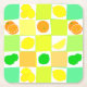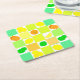 A colourful coaster with a citrus fruit pattern of lemons, limes and oranges on squares of white, orange, teal and yellow.
