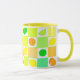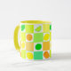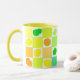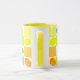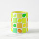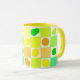 A citrus fruit coffee mug with a colourful retro cooking-themed pattern of lemons, limes and oranges on squares of white, orange, teal and yellow.