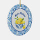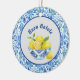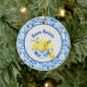 The bowl is decorated with a toile de jouy style pattern, and the border is an azulejo style simulated tile, or some might call it Chinoiserie or toile de juoy, similar to what you might see in Italy, Greece, or Portugal. This lovely ornament will bring a touch of sunny yellow and blue summer to a Christmas tree or any decor, regardless of the weather outside.