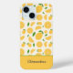 A phone case with a slice, half and full lemon pattern. A customisable first name or text of your choice is available at the bottom. A fresh gift for a friend who loves citrus.