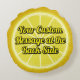 Yellow lemon skin background on front side. Round lemon slice on back side. Custom text on both sides.