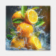 A digital illustration of falling, splashing whole and cut lemons and water.