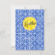 A simple Hello, elegantly presented with a fresh yellow slice of lemon against a blue & white tile background.