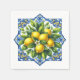 Party paper napkins are shown in the white cocktail size with an art print of a mediterranean lemon tile.