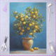A lush lemon tree bursting with ripe golden fruit and tiny white blossoms stands in a rustic clay pot. The textured blue background and sunlit tile floor create a vibrant Mediterranean ambiance. Glossy green leaves and painterly brushstrokes add a lively charm.