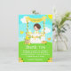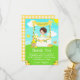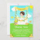 This cute and whimsical thank you card features a brown hair son with fair skin at a yellow lemonade stand which is decorated with flowers and bunting. In the background is a blue sky, sunshine and butterflies. The text combines decorative and sans serif fonts for a stylish and modern look. This is perfect for a summer birthday party.