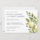 Modern and trendy botanical horizontal wedding invitation featuring a branch of lemons and leaves in a sophisticated palette of soft yellows and olive greens.