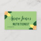 Simple elegant, modern businnes card featuring illustrated lemons and oranges with green leaves scattered on geen background.
