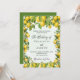 A green watercolored background. Decorated with yellow lemons and green foliage. Personalise and add your names and details. The name is written with a hand lettered style script.