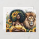 Send a message of strength, beauty, and elegance with this sunflower melanin queen and majestic lion postcard, featuring a stunning Black woman with rich dark brown skin wearing a golden yellow dress surrounded by blooming sunflowers. Her confident gaze and natural afro crowned with flowers capture the essence of power, grace, and unity with nature.