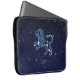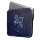 Laptop sleeve featuring the symbol for Leo in soft silver blue, overlaid with the stars of the constellation, against a starry sky background graded from deep midnight blue to black