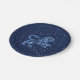 Paper plate featuring the symbol for Leo in soft silver blue, overlaid with the stars of the constellation, against a starry sky background in deep midnight blue