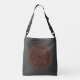This mandala was designed for the zodiac sign, Leo, depicting an onyx stone in the centre surrounded by elements representing the sign, such as the symbol for the sign, the constellation, and the alchemical symbol for Fire, as well as filigree vines and weaves wrapping it all into a solid image in shades of blacks and reddish coppers. This bag is available in multiple sizes and both tote bag and cross body bag styles.