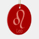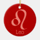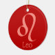 Ornament in the zodiac symbol for Leo in light coral against deep red