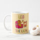Leo the Lion, sitting next to a fire, eating a cup cake and drinking a cup of tea. King of the living room.