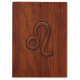 A Leo zodiac sign on a mahogany like print background. A classic rich style design for a great custom birthday gift idea.