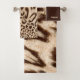 Modern leopard fur pattern design. Wash Cloth is brown colour with your name, hand towel has leopard fur design, so is bath towel. Customise your name.