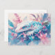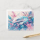 This striking design features a beautiful white leopard gecko shown resting peacefully among a lush arrangement of tropical flora. Created as a high-quality digital illustration in a textured watercolor style, the gecko has creamy white skin adorned with vibrant teal blue spots and deep blue, intelligent eyes. The character is nestled deeply within a vibrant bouquet of hand-painted pink lilies, lavender blossoms, and soft blue tropical leaves that swirl gracefully around its body. Delicate pink paint splatters and shimmering light bokeh effects drift through the airy scene against a soft, off-white background, creating a sense of natural grace and artistic flair. The overall aesthetic is sophisticated, colorful, and full of natural beauty, making it an exceptional choice for reptile lovers and fans of contemporary botanical wildlife art. This elegant gecko postcard is a perfect choice for sending a "thinking of you" note or a meaningful greeting to a friend who admires the exotic beauty of reptiles. You might choose to use this artistic card for a tropical-themed dinner party invitation or to celebrate a professional achievement with a touch of wild elegance for your colleagues. It also makes a beautiful decorative piece for a modern office wall or a stylish addition to a nature journal as a small token of exotic beauty. This versatile design is also an excellent choice for a housewarming message, a graduation thank you note, or as a heartwarming way to share a message of joy for any situation or event.