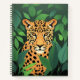 Journal in a leopard with bright, intense eyes peering through lush green foliage. The sharp contrast between the leopard's spotted fur and the vibrant leaves creates a striking visual effect.