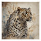 A Leopard with detailed watercolor with expressive eyes is portrayed against a soft, blurred background. The natural colours enhance the lifelike appearance.