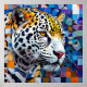 Stylised depiction of a leopard’s head, showcasing vibrant colours and bold geometric patterns in the background. The leopard is portrayed in profile, emphasising its striking features such as its piercing amber eyes, prominent whiskers, and unique spot patterns. The background consists of an array of colourful shapes, creating a dynamic contrast with the leopard's more naturalistic renderings. The overall style blends realism with abstract art, giving it a modern, energetic feel.