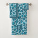 Leopard print and monogram Bath Towel Set in blue tones. This trendy design features a leopard animal print with teal blue borders and monogram.