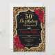Elegant feminine 50th birthday invitation with your photo at the back of the card. Glam black design with animal leopard print and faux glitter gold. Features red roses, script font and confetti. Perfect for a stylish adult bday celebration party. Personalise with your own details. Can be customised for any age! Printed Zazzle invitations or instant download digital printable template.