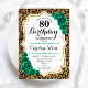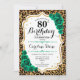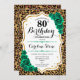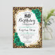80th Birthday Party Invitation. Elegant floral emerald green design with faux glitter gold and roses. Features leopard cheetah animal print and script font. Perfect for a stylish womens bday celebration. Can be customized for any age! Printed Zazzle invitations or instant download digital printable template.