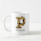 Personalise this custom leopard print lowercase letter "p" coffee mug by adding a name. The options to change the colour of the text for the name, its size, and type of font are available.