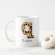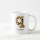 Personalise this custom leopard print lowercase letter "q" coffee mug by adding a name. The options to change the colour of the text for the name, its size, and type of font are available.