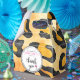 A gift bag for a bachelorette party with a leopard spots wild animal print pattern for the background. A cool looking wine glass with a thick black ink outline and filled with hot pink wine. Thank you written in a trendy hand written font inside a white circle.