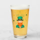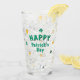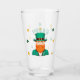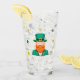 Leprechaun Clover Shamrock Patrick's Day Glass. A festive St. Patrick’s Day-themed glass featuring a illustration of a cheerful man. The man wears a green hat with a black band and a gold buckle and has a bright red beard. His face has a friendly expression with a smile. The glass is surrounded with green and orange shamrocks.