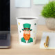 Leprechaun Clover Shamrock Patrick's Day Paper Cups. A festive St. Patrick’s Day-themed cup featuring a illustration of a cheerful man. The man wears a green hat with a black band and a gold buckle and has a bright red beard. His face has a friendly expression with a smile. The cup is surrounded with green and orange shamrocks.